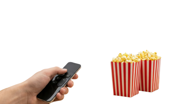 hands holding remote control watching TV while two bowls of popcorn on black background isolated