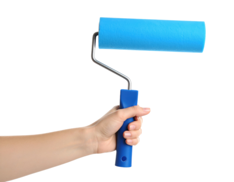 Hand holding a blue paint roller with a tray isolated on transparent background