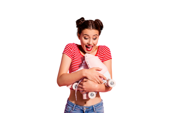 Portrait of her she nice-looking cute attractive lovely magnificent cheerful cheery girl wearing striped t-shirt holding in hands new cool roller skates isolated over pink pastel background