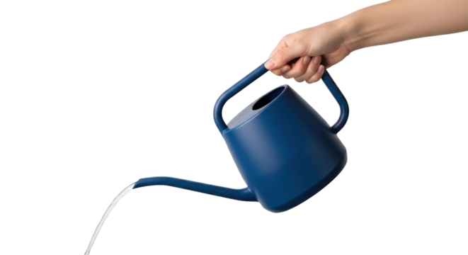 Isolated hand holding dark blue watering can pouring water, tool for gardening and landscaping