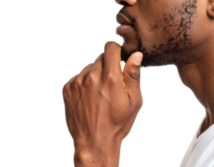 A close-up side profile of a thoughtful African-American man with his hand on his chin on a transparent background.