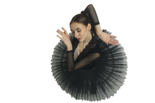 portrait of a young ballerina in a black tutu dancing with her hands moving top view, immersion in dance, isolated on transparent background, png