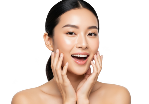 Beautiful young asian woman with healthy glowing skin touching her face, isolated on transparent background
