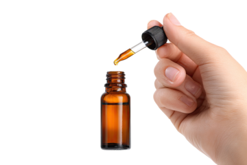 A hand holds a small amber glass bottle, with a dropper dispensing liquid