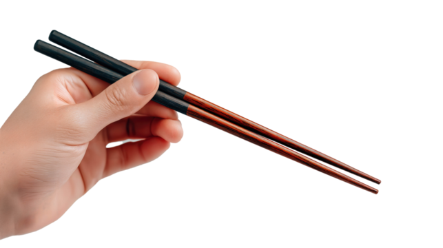 A hand holding a sushi roll with chopsticks against a black background in a studio setting on transparent background