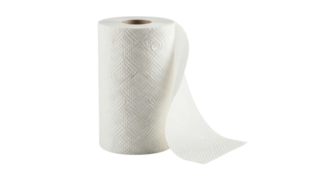 roll of disposable kitchen towels in hand, outstretched hand with roll of disposable kitchen towels isolated on background