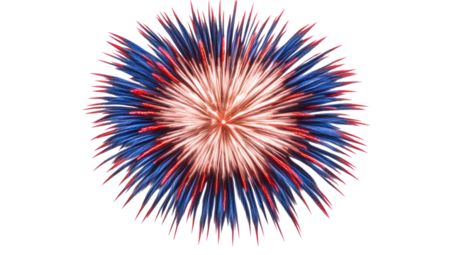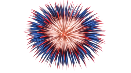 Explosion of blue and red spiky bursts against a white background, cut out transparent