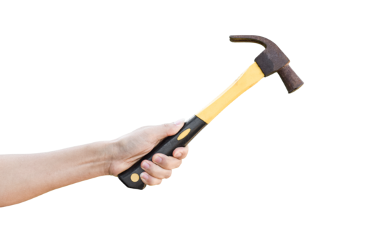 hand holding old rusty hammer isolated on transparent background - PNG format.