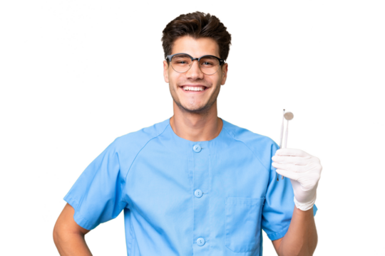 Happy repairman holding hand tools on transparent background