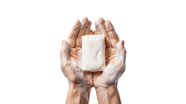 Hands washing with soap and water, creating lather and bubbles, emphasizing hygiene, cleanliness, and health, isolated on transparent background