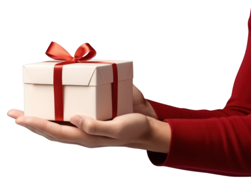 Hands holding red gift box on transparent background celebrating christmas