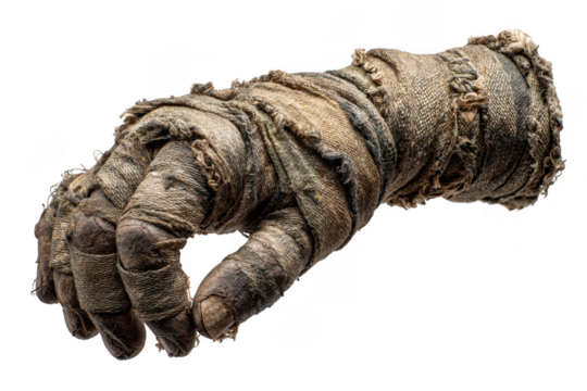 A realistic human hand wrapped tightly in aged, tattered, and textured brown fabric bandages, resembling a mummy's hand.