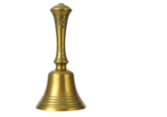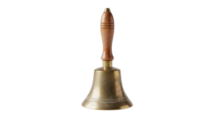 Shiny golden hand bell isolated on transparent background, featuring a wooden handle, polished surface, and classic design, perfect for signaling or decoration
