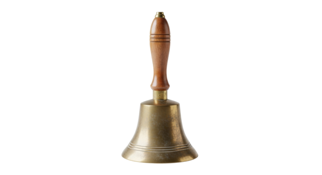 Antique brass hand bell with a dark wooden handle isolated on transparent background