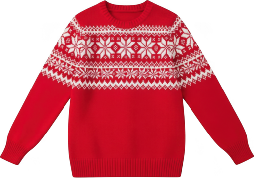 Bright red christmas sweater with white nordic snowflake pattern, isolated on transparent background
