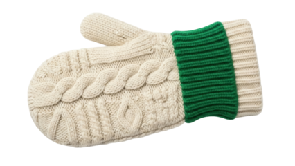 Isolated hand-knitted mitten with a green cuff, winter-themed apparel, woolen accessory