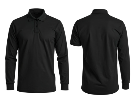 Two views of a plain black long-sleeved polo shirt, front and back