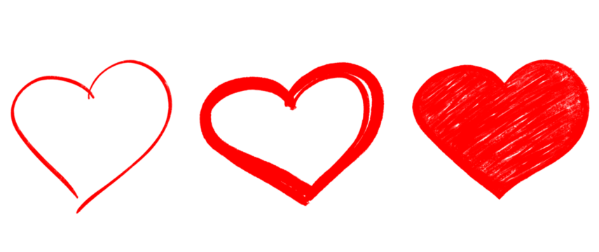 Three red heart icons in a row drawn in different sketchy styles, ranging from thin outline to thick fill. Concept for love, emotion, and graphic design