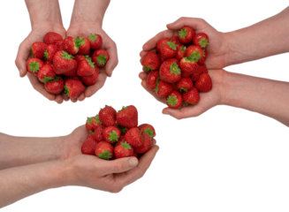Female hand gripping vibrant strawberries with verdant leaves, floating against transparent backdrop