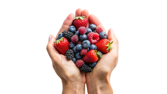 A handful of mixed berries including strawberries, raspberries, and blueberries on a transparent background
