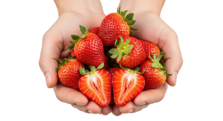 Isolated pile of freshly picked strawberries held by two hands, with one cut in half