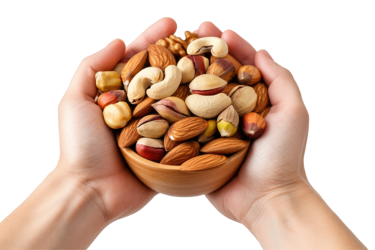 Offering a handful of almonds a symbol of care and nourishment presented in a human palm on transparent background