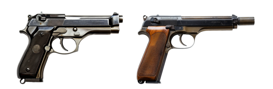 Classic Black and Silver Semi-Automatic Pistols with Wooden Handles Isolated on White Background