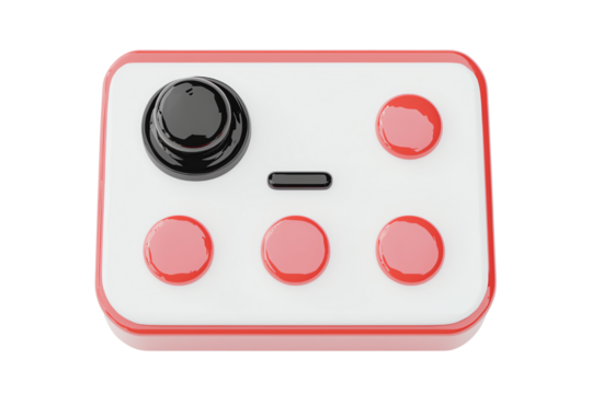 Black arcade fighting game controller with red joystick and orange buttons, isolated on transparent background