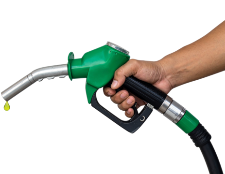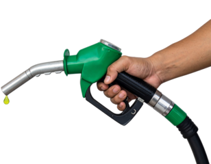 Hand holding a green fuel nozzle, Isolated on transparent or white, Cut out