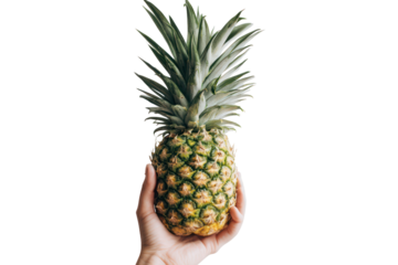 Hand gripping a pineapple by the top leafy crown, transparent background
