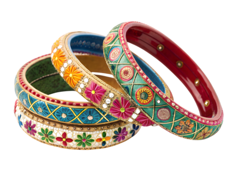 Exquisite handcrafted bangles showcasing vibrant floral designs and intricate jewel embellishments,isolated on white background