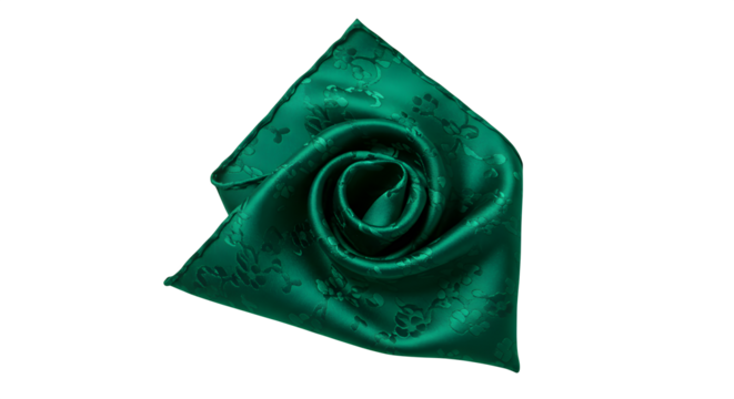Green satin pocket square features floral brocade on black. Provides luxury texture for design, branding, fashion mockups.