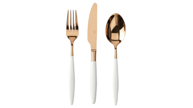 Elegant gold cutlery set isolated PNG, modern flatware with white handles on transparent background for dining and table setting design