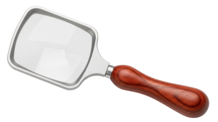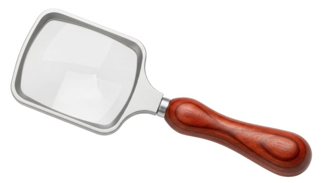 Magnifying glass with wooden handle isolated PNG on transparent background, search tool for inspection and investigation purposes