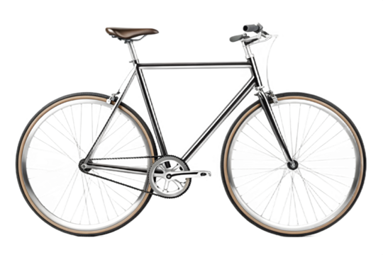 Shiny chrome fixedgear bicycle with brown leather saddle and handlebars, isolated on transparent background