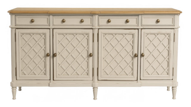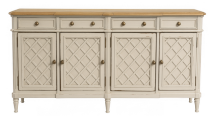 White wooden sideboard with lattice doors and brass handles isolated on a transparent background