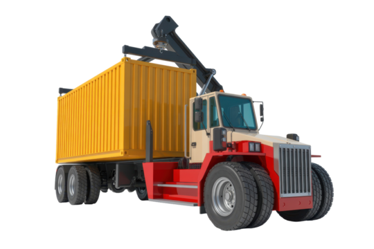 Front view of a Reach Stacker transporting industrial machinery, isolated on a transparent background. 3D illustration.