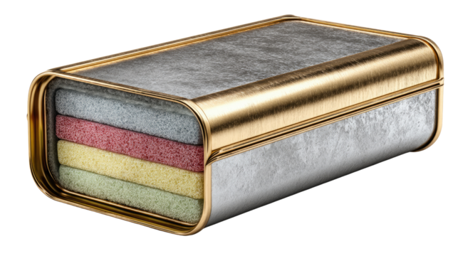 Colorful textile in Elegant Metal Box: A detailed shot of a rectangular metal box with a beautiful design, showing a stack of colorful textiles inside, showcasing both elegance and vibrancy.
