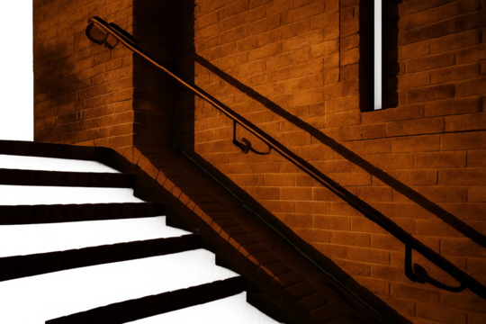Dark brick stairway with vintage iron handrail and warm artificial lighting