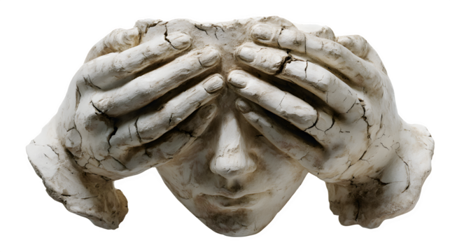 A plaster-cast sculpture of hands covering ears, cracked but mending, isolated on Transparent Background