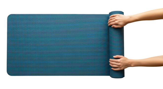 Hands Unrolling Blue Yoga Mat For Fitness And Wellness