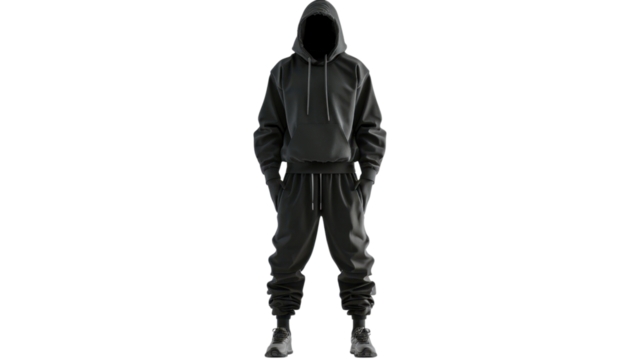 Faceless person wearing dark grey hoodie and sweatpants with hands in pockets on transparent background