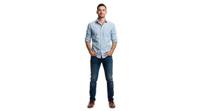 Professional man in blue shirt and black pants standing confidently with hands in pockets transparent background