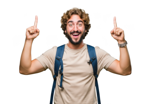 Happy young man with backpack pointing upwards with both hands isolated on transparent background