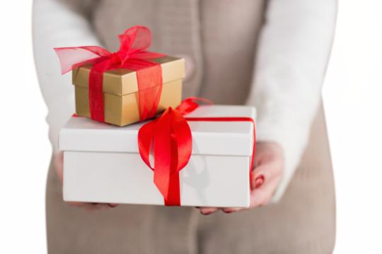 Digital png photo of hands of caucasian woman holding presents on transparent background