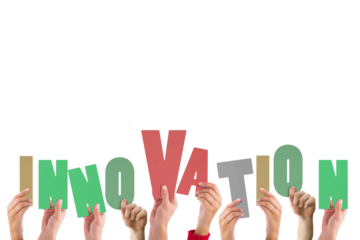 Digital png illustration of hands holding innovation text on transparent background