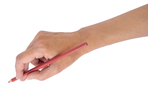 Female hands holding red pencil, writing gesture on transparent background. Concept of drawing, education, creativity, and business planning. Isolated cutout for design use.