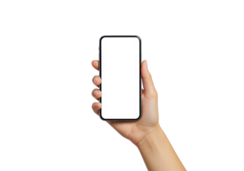 Hand holding smartphone mockup as png photo with blank screen isolated on white background. mobile phone hand mockup