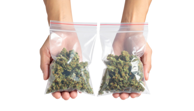 Close-up of male hands holding medical marijuana buds in vacuum seal bags Isolated on Transparent or White Background