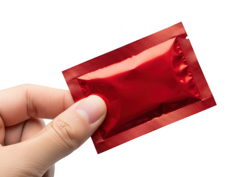 Hand holding a small red foil packet isolated on transparent background
